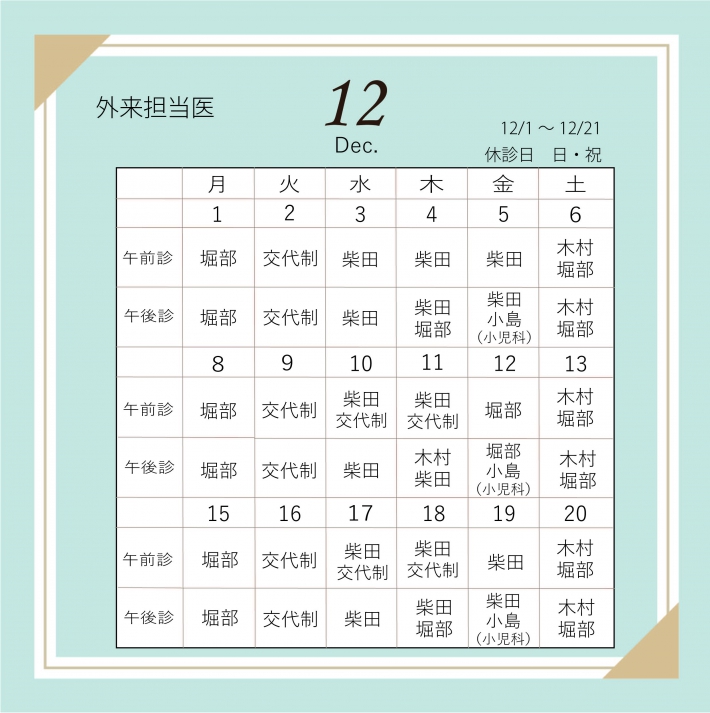 2025年12月1日~21日 外来診察Dr.のお知らせ