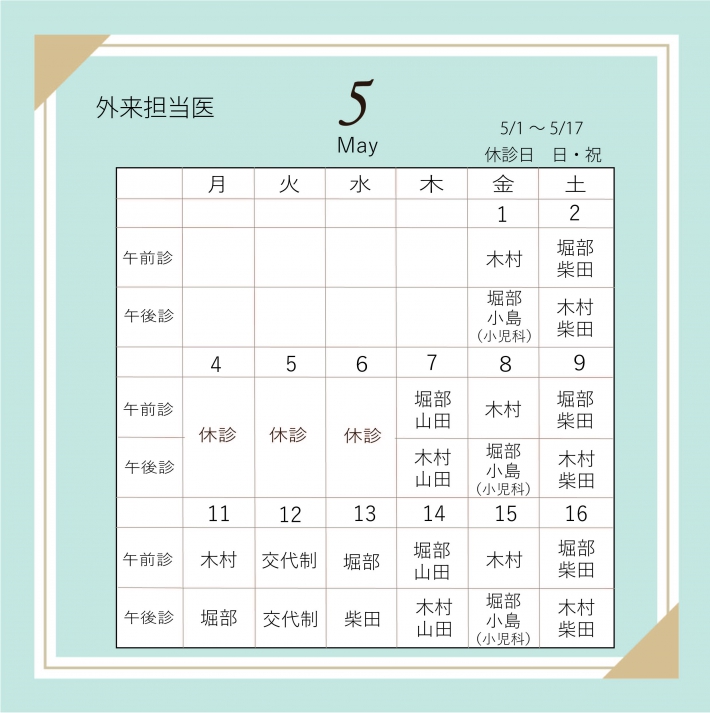 2026年5月1日~17日 外来診察Dr.のお知らせ