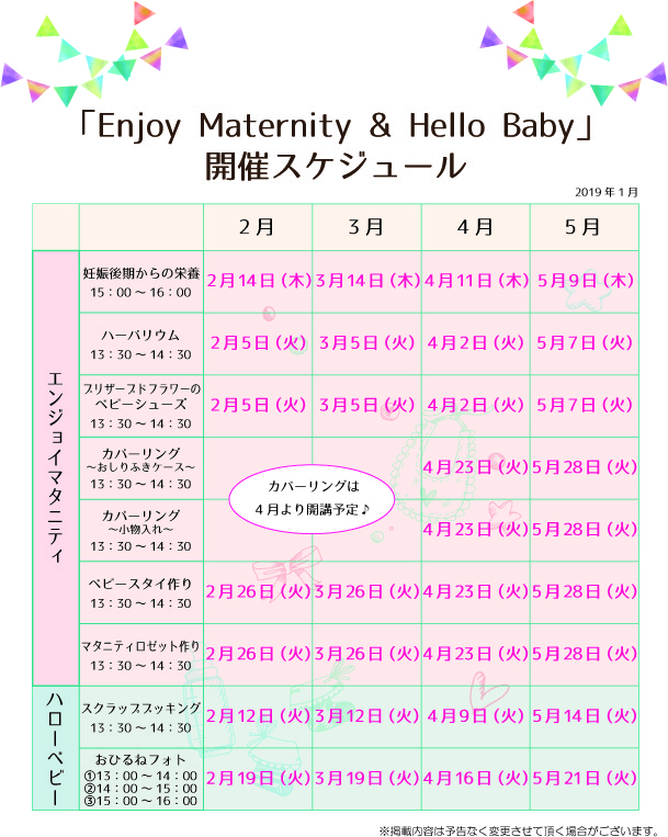 Enjoy Maternity & Hello Baby 2~5月スケジュール